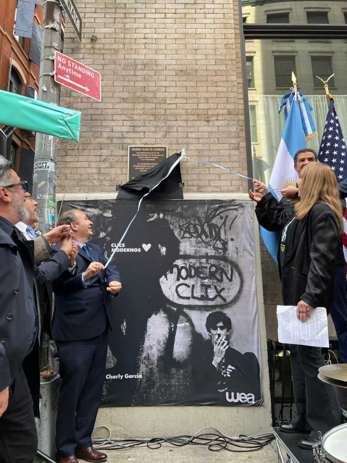 Durante la ceremonia, se descubrió una placa recordatoria en la pared donde el argentino se tomó la foto de tapa, y el cartel verde de las calles neoyorquinas con la leyenda "Esquina Charly García".